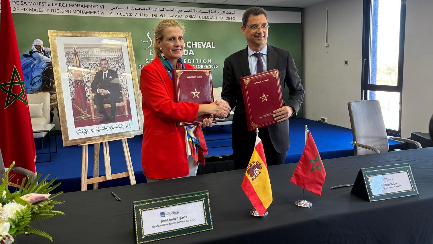 El acuerdo ha sido rubricado por Judit Anda Ugarte, presidenta y consejera delegada de EXPASA, y por Omar Skalli, director general de SOREC, en un acto institucional celebrado en el marco del Salón Internacional del Caballo de Jadida en Marruecos.